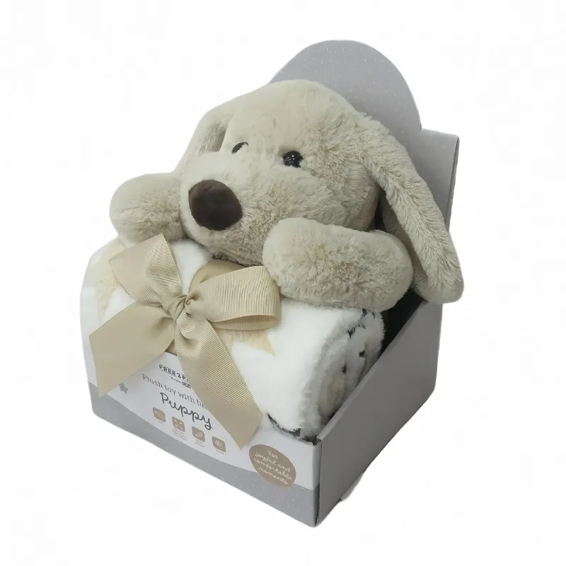 Ovaj neodoljivi set uključuje izuzetno mekanu dekicu i preslatku plišanog psića upakovane u elegantnu poklon kutiju.