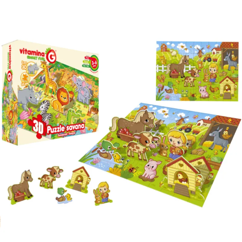 Ovaj 3D puzzle set, idealan za djecu stariju od 3 godine, kombinira zabavu slaganja sa edukativnim sadržajem. Dostupan je u dva uzbudljiva motiva: Farma ili Safari sa savanom. Set sadrži slagalicu od 55 dijelova i 5 figurica za postavljanje u 3D utore, što pomaže u razvoju prostorne percepcije i fine motorike.