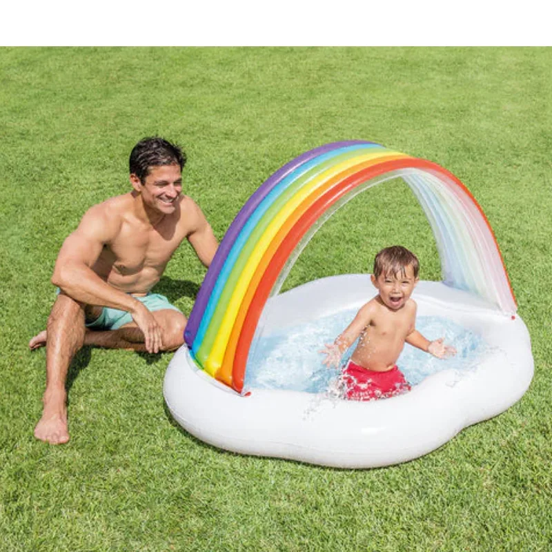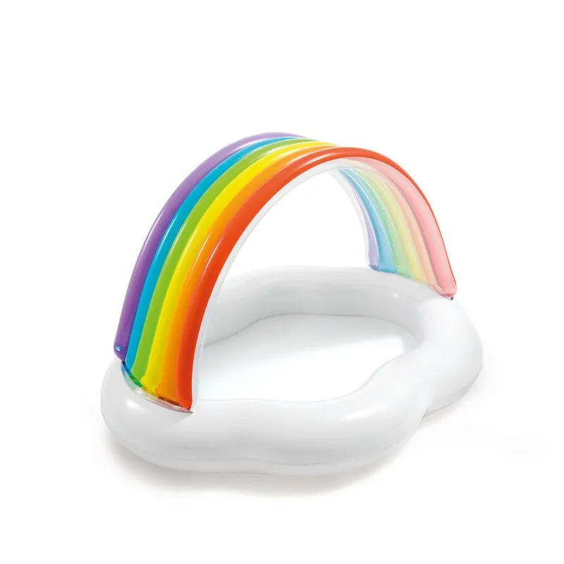 NAPUHIVI DJEČIJI BAZEN: Napuhivi vanjski bazen za djecu u obliku duge i oblaka. Dimenzije kada je potpuno napuhan: 142 cm x 119 cm x 84 cm