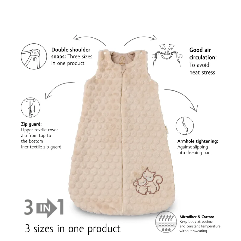Stil: 3 u 1 vreća za spavanje bez rukava, podesiva u tri veličine s patentnim zatvaračem sprijeda.