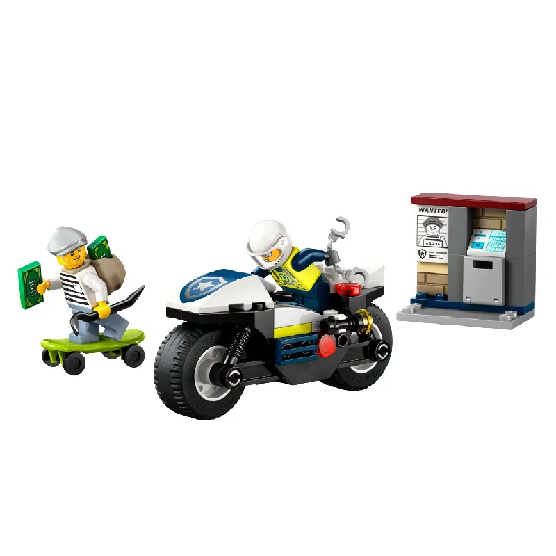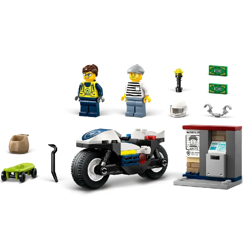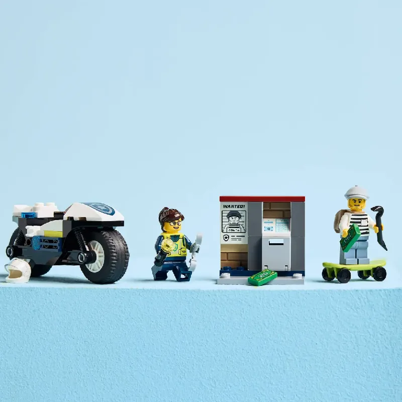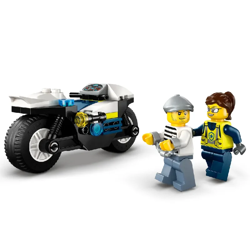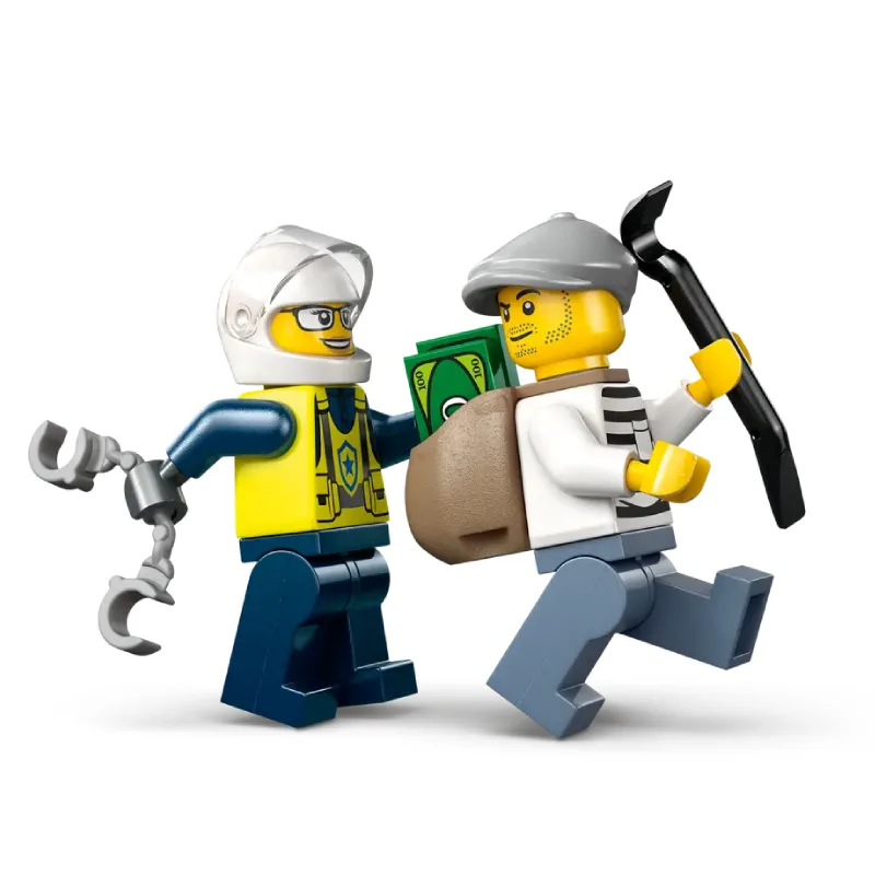 U setu se nalaze dvije minifigure: neustrašivi policajac na policijskom motoru i lukavi lopov na njegovom brzom motoru za bijeg. Glavni cilj je vratiti ukradenu zlatnu polugu, koja se nalazi u kutiji na motoru lopova.