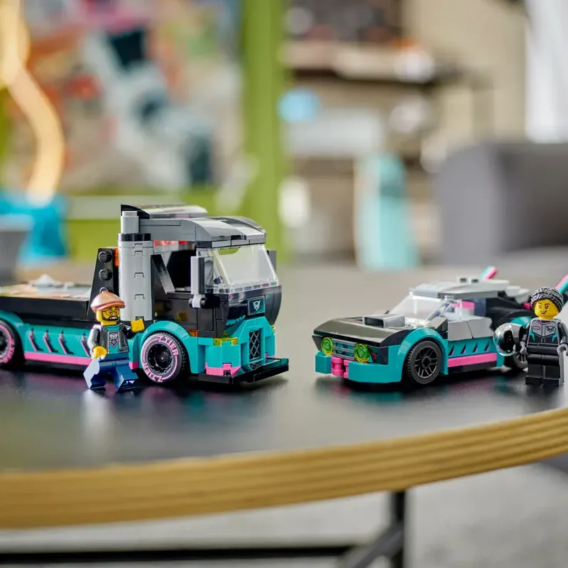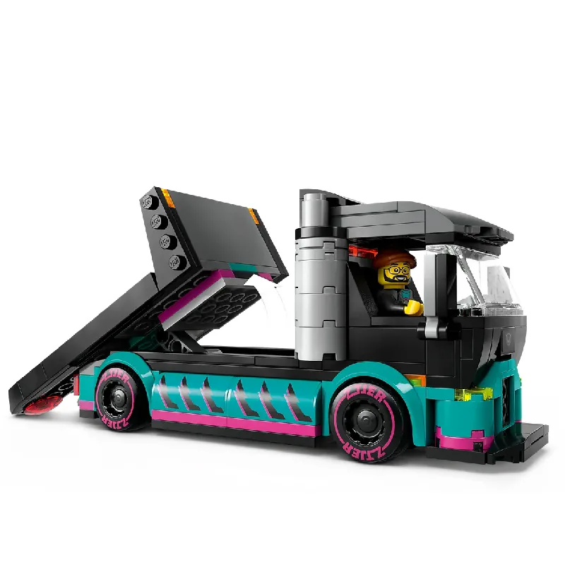 Sastavite snažni kamion za prijevoz trkaćih auta s funkcijama koje omogućavaju spuštanje i podizanje rampe. U setu se nalazi i futuristički trkaći auto, spreman da se utrkuje s protivnicima. S uključenim figurama vozača, ovaj set omogućava da kreirate vlastite utrke i avanture.